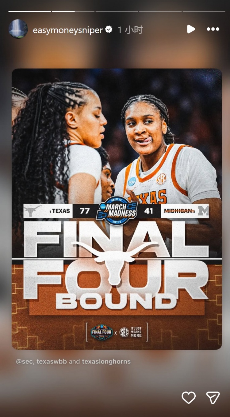 3月31日讯 今日NCAA女篮1/4决赛,德克萨斯大学77-41大胜密歇根大学,晋级四强。曾效力于德克萨斯大学的杜兰特在INS上晒出了克莱“四根手指”表情包,庆祝母校晋级四强。...